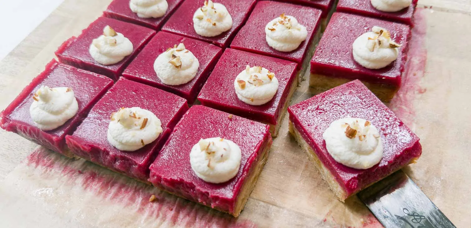 Luscious, velvety cranberry-orange curd on a sweet, almond-infused crust is topped with a light, airy cream for the perfect festive bite.