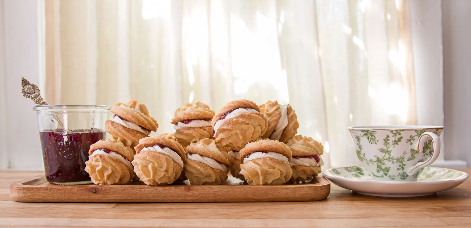These festive and beautiful British biscuits feature a tender whirl enriched by Odense Almond Paste, perfectly complementing luscious buttercream and tart jam filling.